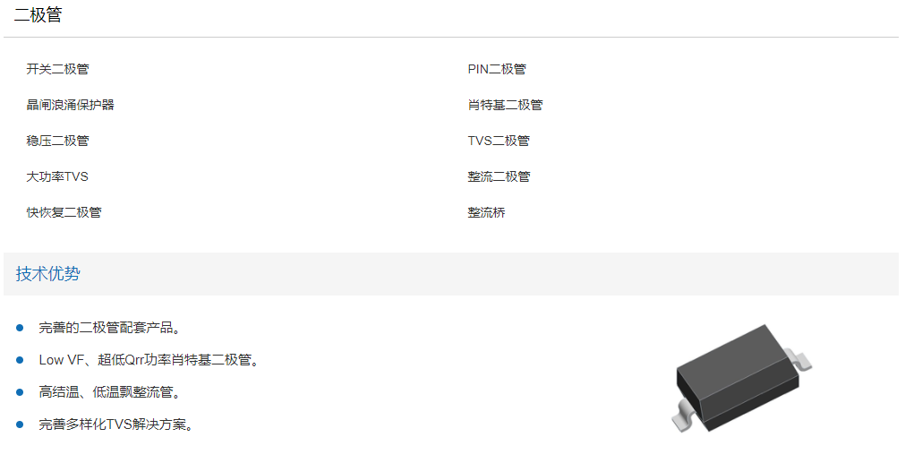 開關二極管  PIN二極管  晶閘浪涌保護器  肖特基二極管  穩壓二極管  TVS二極管  大功率TVS  整流二極管  快恢復二極管  整流橋